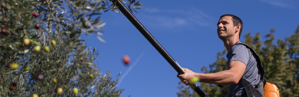 Alors que l’automne pare nos paysages viticoles de camaïeux de jaunes orangés, l’olivier prépare son nectar. Il faut savoir être patient, attendre que les fruits se colorent, que la nature accomplissent son travail avant de commencer les "olivades". La récolte est semi-mécanique afin de protéger l’arbre et ses racines. Peigne électrique ou manuel, filets au sol, toute la famille participe. Sitôt les fruits tombés, le moulinier prend le relais afin d’extraire au plus vite ce jus de fruit doré.
